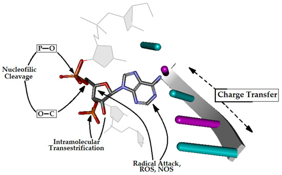 A graphical representation of RNA phosphate diester bond cleavage and possible pathways to nucleic acid injury, such as intramolecular transesterification, oxidative cleavage, and nucleobase modification in the cell environment.