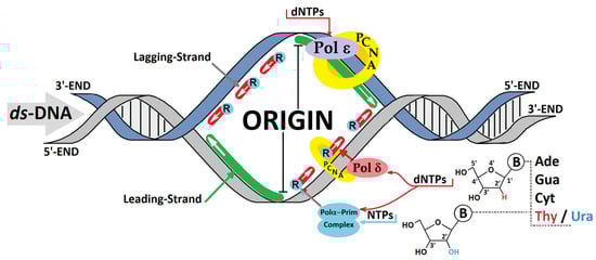 Electron or hole transfer through the double helix is sensitive to the spatial arrangement of nucleobases, such as heterocyclic ring overlapping (stacking) and hydrogen bonding [11]. Their disruption can lead to serious consequences during hole hopping, polaron migration and tunnelling. Charge transfer can be affected not only by DNA lesions, such as 8-oxo-Gua, and pyrimidine dimers, such as T^T, but also by mismatches. High-fidelity polymerases (replicases) can incorporate an incorrect nucleoside at a frequency of one per thousand during genetic information replication [12,13]. Moreover, if the concentration of ribonucleoside triphosphates (NTPs) is higher than that of deoxyribose (dNTPs) in the cell environment, the misincorporation of nucleotides with different sugar moieties is much more common [12]. It has been estimated that, even with a sterically clashing polymerase active centre, pol ε/δ (replicase) incorporates 1 NTP per 1250–5000 nucleotides [14]. Meanwhile, for pol α, this figure has been found to be 1 per 625 bases due to the lack of an exonuclease subunit [15,16]. This indicates that more ribonucleosides appear during lagging-strand synthesis through Okazaki fragments, where pol α–primase complex activity is present (Figure 2) [17]. In one replication cycle, 13,000 ribonucleotides can appear in the yeast genome [15] and approximately 106 in vertebrate cells [18]. The ribonucleotide part is removed (repaired) from the genome by the ribonucleotide excision repair (RER) machinery [19,20].