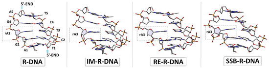 The initial structures of the double-stranded oligonucleotide with a ribonucleoside moiety (adenosine) were built using the BioVia Discovery Studio v20.1.0.19295 software [21] and noted as follows: R-DNA d[T1C2T3C4T5]*d[A5G4]rA3[G2A1], RE-R-DNA d[T1C2T3C4T5]*d[A5G4]X3[G2A1] (X: 2′,5′-phosphodiester linkage), IM-R-DNA d[T1C2T3C4T5]*d[A5G4]Z3[G2A1] (Z: the pentacoordinated species, called pentaoxyphosphorane), and SSB-R-DNA d[T1C2T3C4T5]*d[A5G4]Y3[G2A1] (Y: 2′,3′-cyclic-phosphate). The optimised spatial structures of the ds-oligos are shown in Figure 3.