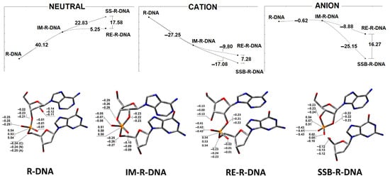 Upper graphs represent the energy profile of the phosphodiester bond cleavage or migration via an intermediate state in the neutral, anion and cation forms of the discussed ds-oligonucleotides. Botton: The charge distribution on atoms involved in the phosphodiester linkage. The results have been obtained at the M062x/6-31++G** level of theory in the aqueous phase using the Hirshfeld methodology. The raw data are given in Supplementary Materials Table S1.