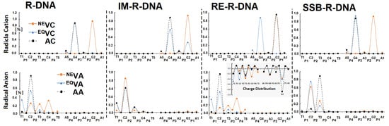 Moreover, the discussed phosphodiester bond rearrangement did not significantly affect the hydrogen bond length between adenosine (A3) and the complementary thymidine (T3) in the neutral state of all the discussed oligos, except for SSB-R-DNA, for which significant HB-2 shortening to 2.65 [Å] was noted. Similarly, this rearrangement was observed after electron loss by the ds-oligo; however, in the case of R-DNA, shorter HB-1 (2.85 [Å]) and HB-2 (2.66) [Å] were calculated. Surprisingly, introducing an extra electron into the system did not affect HB-1 at all, while a shorter HB-2 was observed for IM-R-DNA (2.88 [Å]). As shown in Table 1, the fluctuations of HB-1/HB-2 were assigned in the length ranges of 0.1/0.23, 0.17/0.18, and 0.03/0.15 [Å] for the neutral, anionic and cationic states of the ds-oligo, respectively.