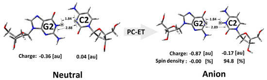The situation was similar when an additional electron appeared within the double helix. As shown in Figure 6, in the non-equilibrated state of the vertical radical anion, the spin was not concentrated on a single nucleoside but dispersed over three pyrimidines (C2, T3, and C4) of R-DNA and RE-R-DNA or two (i.e., C2 and T3) of IM-R-DNA and SSB-R-DNA. Relaxation of the solvent–solute interaction leads to the equilibrated state of vertical radical anion formation. The analysis of the spin density reveals the accumulation of unpaired electrons at the C2 moiety at around 60%. The subsequent structure relaxation (ground-state achievement) leads to the adiabatic radical anion state, where the spin is localised exclusively at 2′-deoxycytidine (C2). Surprisingly, single-strand break formation leads to its localisation at thymidine (T3). It should be pointed out that, in each cell, an SSB is formed every 1 or 2 s [55]. The charge analysis of all the discussed cases shows that their location has the same pattern as unpaired electrons (Table S2). Surprisingly, after 3′,5′-phosphodiester bond migration to the 2′,5′-internucleotide linkage (i.e., R-DNA→RE-R-DNA), the negative charge is localised mainly on the 2′-deoxyguanine (G2) moiety, while the spin is found at the 2′-deoxycytidine (C2) of the dG2:::dC2 nucleoside pair (Figure 6, Table S2). The structure analysis of the dG2:::dC2 nucleoside pair (extracted from RE-R-DNA) indicates a proton transfer from the N1 of guanine to the N3 of cytidine (Figure 7).