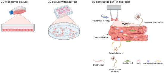 - Carraro, E.; Rossi, L.; Maghin, E.; Canton, M.; Piccoli, M. 3D in Vitro Models of Pathological Skeletal Muscle: Which Cells and Scaffolds to Elect? Front. Bioeng. Biotechnol. 2022, 10, 941623. [Google Scholar] [CrossRef]