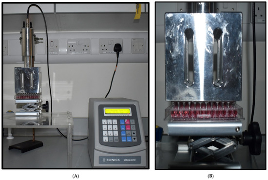 Ultrasound probe system. (A) Image of the US probe system. (B) Image of the probes demonstrating the position of the microplates for cell treatment.