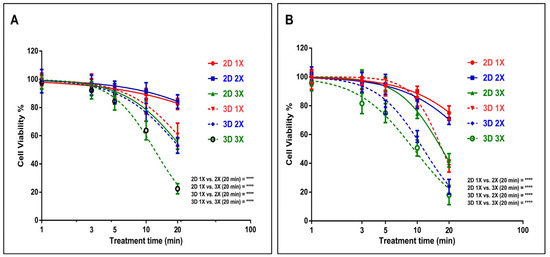 During studies of A431 human epidermoid carcinoma, an IC50 of 46.0 min (42.46 to 49.83 min), 38.05 min (35.07 to 41.29 min), and 17.05 min (16.77 to 17.33 min) was found for A431 2D cells, while an IC50 of 17.14 min (16.87 to 17.43 min), 11.40 min (11.20 to 11.60 min), and 9.239 min (9.018 to 9.466 min) was found for A431 3D tumour spheres during single, double, and triple US treatments, respectively (Figure 2B). The results from the two-way ANOVA indicate a significant difference in cell viability for both U-251 MG and A431 cells, both in 2D and 3D cultures, concerning varying doses of US exposure (p < 0.0001). For example, the 2D 1×, 2×, and 3× groups with the highest treatment time (20 min) showed statistically significant differences (**** p ≤ 0.0001) when compared to the 3D 1×, 2×, and 3× groups in both the U-251 MG and A431 cell lines (Figure 2). Further details regarding Tukey’s multiple comparisons test can be found in the DOI link.