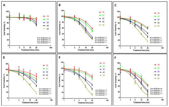 A two-way ANOVA revealed a significant disparity in viability concerning the doses of single and multiple US treatments, as well as different post-treatment incubation periods (p < 0.0001). For example, the 1× US treatment with the longest exposure time (20 min) showed statistically significant differences when compared to the 5× US treatments across all incubation durations (Figure 3). Additional details regarding Tukey’s multiple comparison test can be found in the DOI link.