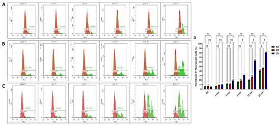 PI uptake in ultrasound-probe-treated U-251 MG tumour spheres. PI uptake was quantified through flow cytometry and served as an indicator of cell death. Cells were treated for 1, 3, 5, 10, and 20 min. PI uptake was subsequently measured 24 h post-treatment in (A) single US treatment, (B) double (2×) US treatment, and (C) 5× US treatment (the positive control can be seen in the supporting information as Figure S1). (D) The normalized PI uptake was then assessed 24 h after single and multiple treatments and depicted in a bar chart. The panels (A–C) are representative of 3 replicates. All data points showed statistical significance, with the exception of the control and 1 min treatment times. ns, not significant; * p ≤ 0.05.