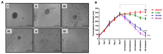 U-251 MG tumour sphere morphology and size (diameter) variation analysis followed by US treatment. (A) U-251 MG tumour sphere morphological changes with 20 min US treatment (100× magnification) ((I)—before US treatment; (II)—24 h after 1st treatment; (III)—24 h after 2nd treatment; (IV)—24 h after 3rd treatment; (V)—24 h after 4th treatment; (VI)—24 h after 5th treatment). (B) U-251 MG tumour sphere size (diameter in µm) followed by different US treatment times (exposure durations of 1, 10, and 20 min). ns, not significant (p > 0.05); *** p < 0.001; **** p < 0.0001.