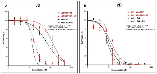 TMZ cytotoxicity analysis with and without US (3 min) combination using U-251 MG and A431 2D cells and 3D tumour spheroids. (A) TMZ cytotoxicity in 3D cell cultures after 144 h of incubation. (B) TMZ cytotoxicity in 2D cell cultures after 144 h of incubation. ns, not significant (p > 0.05); **** p < 0.0001.