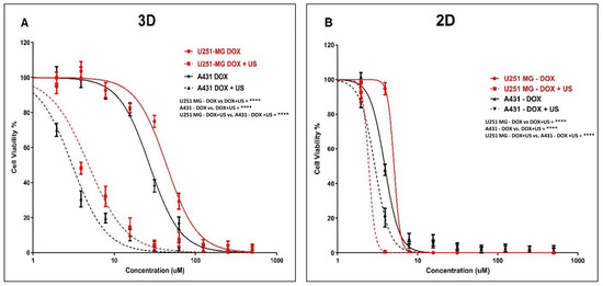 After investigating the synergistic effect of US and DOX on 3D tumour spheres, we then extended our study to compare the activity of U-251 MG and A431 in 2D cells with 144 h post-treatment incubations. An IC50 of 5.072 µM (4.701 to 5.472 µM) and 2.454 µM (1.965 to 3.065 µM) was found for U-251 MG 2D cells during DOX treatment without and with US, respectively (Figure 7B), while an IC50 of 3.884 µM (3.721 to 4.055 µM) and 2.922 µM (2.786 to 3.065 µM) was determined for A431 2D cells during DOX treatment without and with 3 min US exposure, respectively (Figure 7B).