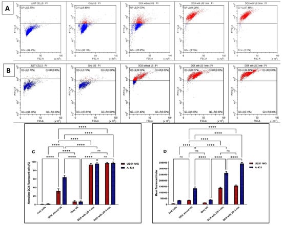 Ultrasound-enhanced penetration of DOX.H fluorescence analysis using flow cytometry of U-251 MG and A431 tumour spheres. (A) U-251 MG. (B) A431. (C) The normalized percentage of DOX-positive cells was then measured at 48 h post-treatment incubation and represented as a bar chart. All the data points were statistically significant except DOX with US 1 min and 3 min treatment times. ns, not significant; **** p ≤ 0.0001. (D) The mean fluorescence index was measured at 48 h post-treatment incubation and was used to plot the values on columns to identify the amount of DOX getting into the tumour spheres. All the data points were statistically significant except U-251MG DOX with US 1 min and 3 min treatment times, as well as U-251MG treated with DOX without US compared to the control (cells only) and the US-only treatments. ns, not significant; **** p ≤ 0.0001.