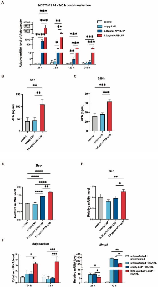 Transfection with APN-LNP promoted osteogenesis in MC3T3-E1 and inhibited Mmp9 expression in RANKL-stimulated RAW264.7 cells. (A) MC3T3-E1 cells were transfected with APN-LNP (0.25 and 1.0 μg/mL) for 24 h, followed by incubation in AMEM. APN mRNA expression was analyzed using qPCR. (B,C) APN protein levels were measured in the supernatants at 72 and 240 h by ELISA. (D,E) The expression levels of osteogenesis-related markers, bone sialoprotein (Bsp), and osteocalcin (Ocn), were also evaluated. (F) RAW 264.7 cells were transfected with APN-LNP at 0.25 μg/mL for 12 h and subsequently stimulated with 100 μg/mL RANKL in AMEM. Empty-LNP served as a control. APN and Mmp9 gene expression were assessed separately using qPCR. * p < 0.05, ** p < 0.01, *** p < 0.001 and **** p < 0.0001. Data were expressed as the mean ± SD at three biological independent experiments.