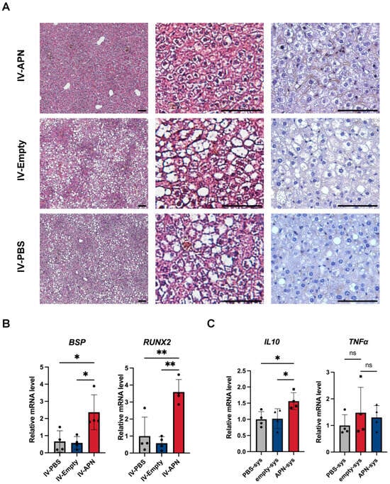 Analysis of contralateral femur tissues revealed that mRNA expression levels of osteogenic markers Bsp and Runx2 were significantly elevated in the APN-LNP group compared to both the empty-LNP and control groups (Figure 5B).
