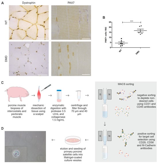 Detection of PAX7+ SC in dystrophin-deficient muscle sections and SCs isolation pipeline. (A) Immunohistochemistry of dystrophin and PAX7 in paraffin-embedded PECT muscle sections of DMD and age-matched WT controls. DMD tissue demonstrates absent sarcolemmal dystrophin signal (brown) and high amounts of PAX7+ cell nuclei (brown). Scale bars = 50 µm (dystrophin) and 25 µm (PAX7). (B) Significantly higher amounts of PAX7+ cells were detected in DMD (n = 6, triangle, 16.70 ± 1.471) muscle sections when compared to WT (n = 6, dots, 4.467 ± 1.137; *** p < 0.001); each dot represents one individual; unpaired t-test was used for statistical testing and results are shown as mean and SEM. (C) Schematic overview of isolation procedure of primary porcine SCs derived from INT and PECT muscle biopsies of DMD and WT animals. (D) Representative light microscopy pictures of seeded SCs directly after isolation; insert showing magnetically labeled cell. Magnification 10× and 40×, respectively.