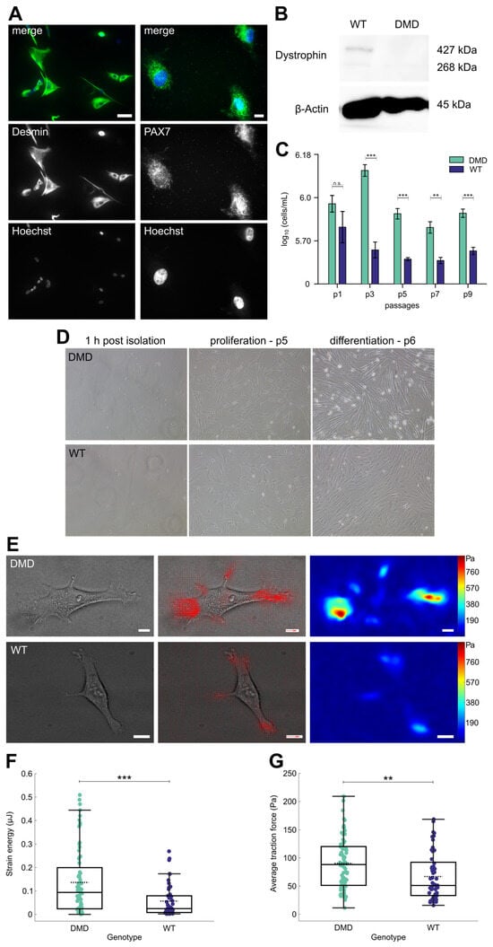 Characterization of isolated porcine SCs and quantification of traction forces in single SC. (A) Immunofluorescence staining of cultured DMD SCs after isolation using desmin (green) and PAX7 (green) antibodies to confirm the cells’ identity. Hoechst (blue) was used as a nuclear counterstain. Magnification desmin 20×, scale bar = 50 µm. Magnification PAX7 63×, scale bar = 30 µm. (B) Western blot analysis to detect dystrophin expression in DMD and WT SCs lysates. A band at approx. 427 kDa indicates dystrophin expression in WT cells, which is completely absent in lysates of DMD cells. β-Actin was used as loading control. (C) Amount of log10 (cells/mL) for DMD (n = 4, green) and WT (n = 4, purple) over the span of 9 passages (p) in vitro; values are displayed as mean and SEM, n.s. not significant, ** p < 0.01, *** p < 0.001. (D) Representative bright-field pictures of primary porcine SCs culture in vitro 1 h post isolation, during proliferation at p5 and after serum withdrawal to induce differentiation at p6. Magnification 10×. (E) Representative bright-field images of DMD and WT SCs (left) in p7, with corresponding traction force vector (quiver) plots (middle) and traction force magnitude maps (right). In the quiver plots, red arrows indicate the direction and relative magnitude of traction forces exerted by the cells; the reference arrow corresponds to 1 kPa. The color-coded traction map displays force magnitudes in Pascals (Pa), with red indicating high traction stress and blue representing low or negligible force. Areas without cells appear blue, reflecting the absence of measurable traction. Force hotspots typically align with regions of strong cell–substrate interaction, such as focal adhesion sites; scale bar = 10 µm. (F) Strain energy (DMD, green, 72 cells, 0.136 ± 0.016 µJ; WT, purple, 50 cells, 0.057 ± 0.008 µJ, *** p = 0.00052) and (G) average traction force levels (DMD 90.391 ± 10.508 Pa; WT 66.948 ± 8.867 Pa; ** p = 0.0018) visualized as box plots overlaid with swam charts; each dots represents one cell; two-tailored Mann–Whitney U test was used for statistical testing and results are presented as mean ± SEM.