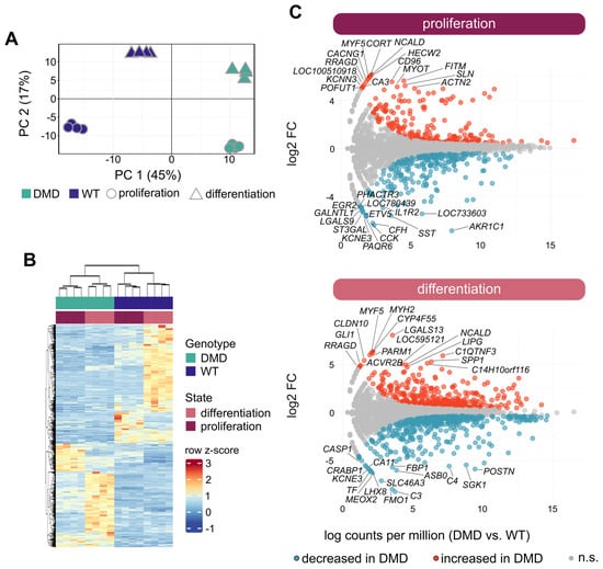 To obtain insight into the effects of dystrophin deficiency on the transcriptome of SCs in a proliferative state (PROL) as well as during differentiation into myotubes (DIFF), RNA isolated from DMD (n = 4) and WT (n = 4) SCs samples were analyzed by 3′ mRNA-seq (adapted from [37,38,39]). We performed preliminary experiments to compare SCs from INT and PECT muscles and did not detect differences. Based on this observation, we focused the extensive omics investigation on SCs derived from INT muscle only. Principal component analysis (PCA) clearly separated the transcriptome profiles of DMD SCs and WT SCs, both at the PROL and DIFF states, in the first two principal components (PC1 and PC2) (Figure 3A). Unsupervised hierarchical clustering further confirmed the genotype- and state-dependent separation of transcriptome profiles (Figure 3B).