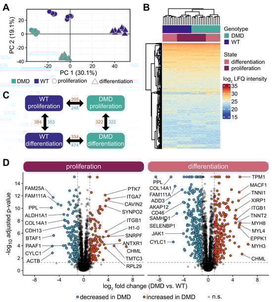 Proteome analysis of DMD and WT SCs. (A) Principal component analysis of the proteome profiles of SCs derived from DMD (n = 8, green) and WT (n = 8, purple) animals in proliferation (dots) and differentiation (triangles) state; each dot represents one individual. The percentage of variation in each component is indicated. (B) Heat map and unsupervised hierarchical clustering of protein intensity values from proteome expression profiles of DMD and WT SCs. (C) Differentially abundant proteins within (horizontal) and between (vertical) DMD and WT SCs proliferation (vertical) and differentiation (horizontal) state. Numbers of proteins with significantly higher (red) and lower (blue) abundance with an adjusted p-value of <0.05 and a |log2 fold change| > 0.6. (D) Volcano plots of differentially abundant proteins between DMD and WT SCs in proliferative or differentiated state—two-way ANOVA followed by Tukey Honest Significant Differences was used for statistical testing; as significance cut off adjusted p-value < 0.05 and log2-fold change >0.6/<−0.6 was used. Proteins are represented as dots; red color indicates higher and blue lower abundance in DMD cells, n.s. not significant.