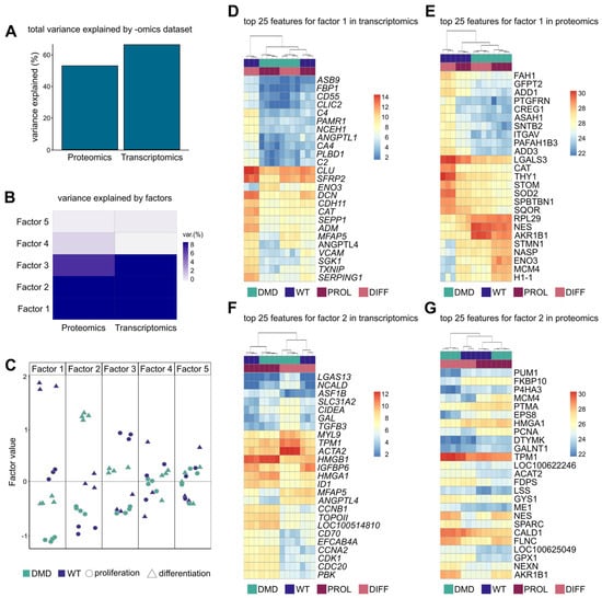 Multi-omics factor analysis of transcriptome and proteome of DMD and WT SCs. (A) Cumulative variance explained by each -omics modality in percentage. (B) Percentage of variance explained by factors identified by multi-omics factor analysis within the transcriptomic and proteomic data. Higher percentages of variance among the -omics layers indicate a higher amount of shared variability. (C) Swam plot of factor values reveals clustering of DMD (n = 4, green) and WT SCs (n = 3, purple) in proliferation (dots) and differentiation (triangles); each dot represents one individual. (D) Top 25 features contributing to factor 1 from transcriptomic and (E) proteomic data. (F) Top 25 features contributing to factor 2 from transcriptomic and (G) proteomic data. Heat maps display the distribution of the features across the samples.