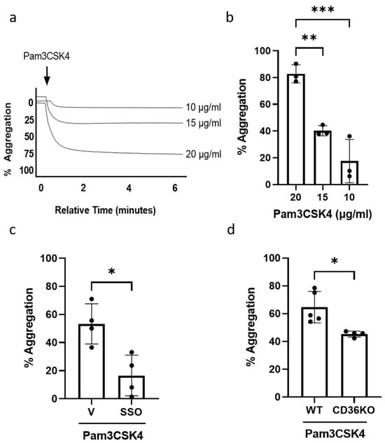 We first confirmed that Pam3CSK4 induces platelet aggregation in human platelets and observed a dose-dependent increase in aggregation following the treatment of platelets with increasing concentrations of Pam3CSK4 (Figure 1a,b). SSO, a CD36-blocking agent, has been shown to inhibit CD36 by irreversibly binding to the lysine 164 [30]. When SSO was used to pre-treat the human platelets before Pam3CSK4 stimulation, platelet aggregation was significantly inhibited (Figure 1c). In CD36KO murine platelets, Pam3CSK4-induced aggregation was inhibited compared to the WT group (Figure 1d). These data have demonstrated that platelet aggregation initiated by TLR1/TLR2 activation occurs via the CD36-mediated pathway in both human and murine platelets.