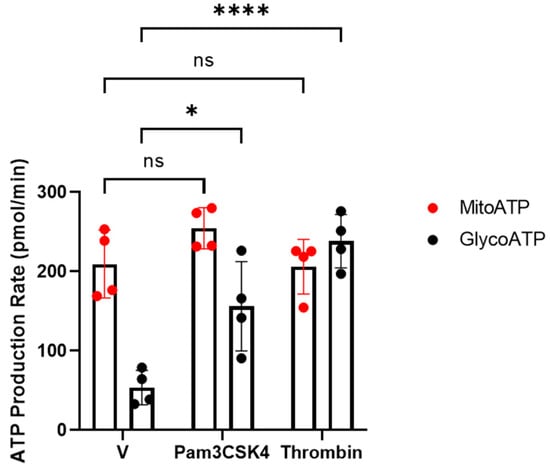 Changes in ATP production rates in response to Pam3CSK4 and thrombin. WPs (2 × 108 platelets/mL) from healthy volunteers were stimulated with vehicle (V), 0.05 U/mL thrombin, or 20 µg/mL Pam3CSK4 and the mito- (red) and glyco-ATP (black) production rates were measured using the Agilent Seahorse real-time ATP rate assay. Data are expressed as mean ± SD (n = 4). Data were analysed by a two-way ANOVA followed by a post hoc test (Tukey’s): * p < 0.05, **** p < 0.0001.
