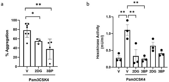 As Pam3CSK4 activation increased the level of glycoATP in platelets, we then evaluated whether this increase in glycolysis was essential for Pam3CSK-mediated platelet activation or whether the level of mitoATP was sufficient to meet cellular ATP requirements. Hexokinase (HK) catalyses the first step in glucose metabolism in the cells, converting glucose to glucose-6 phosphate. HKs exist as three isoforms (HK 1–3) and the related glucokinase [31]. Proteomic and biochemical studies indicate that HKs are expressed in platelets [12,32]. When platelets were pre-treated with a pan-HK inhibitor, 2DG [33,34], Pam3CSK4-induced aggregation was reduced to 70% (Figure 3a). Moreover, greater inhibition (approximately 50%) was observed following pretreatment with HK2-specific inhibitor 3BP [35]. In further support of the TLR1/TLR2-dependent regulation of glycolysis, Pam3CSK4 was found to significantly upregulate HK activity in platelets, which was abolished in the presence of both 2DG and 3BP (Figure 3b). Taken together, these data demonstrated that TLR1/TLR2-induced platelet aggregation and activation require metabolic reprogramming and an increase in platelet glycolysis that is mediated by HK activation.