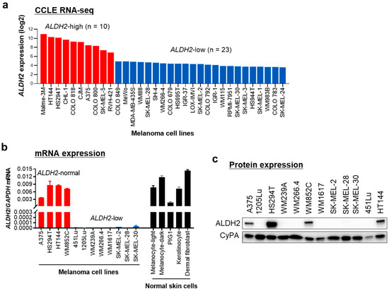 In addition, ALDH2 gene expression data of Cancer Cell Line Encyclopedia (CCLE) human metastatic melanoma cell lines were downloaded from the Gene Expression and Mutations in Cancer Cell Lines (GEMiCCL) database [26].