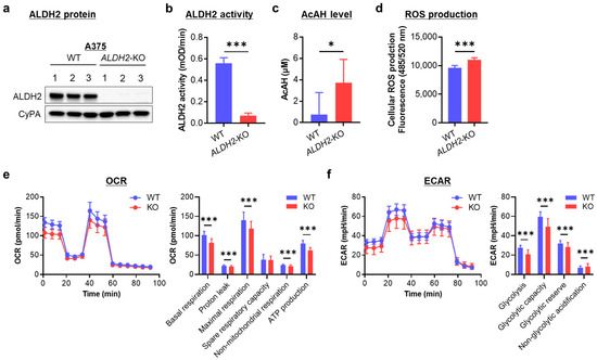 Effects of knocking out ALDH2 on acetaldehyde (AcAH) and reactive oxygen species (ROS) production and cellular energy metabolism in A375 cells. (a) ALDH2 knockout (KO) was confirmed by Western blot in three single-cell clones. WT, wild-type. (b) Mitochondrial ALDH2 activity. (c) AcAH levels in the culture medium of cells. (d) Intracellular ROS levels were detected using a DCFDA cellular ROS assay kit. (e) Cellular oxygen consumption rate (OCR) was measured with the Seahorse XF Cell Mito Stress Test kit. Left: respiratory flux profile; right: quantification of respiratory parameters. (f) The extracellular acidification rate (ECAR) was measured with the Seahorse assay. The data are representative of 2–4 experiments and expressed as the mean ± SD (n = 3 (b), 7 (c), 12 (d) or 19 or 22 (e,f)). * p < 0.05 and *** p < 0.001.