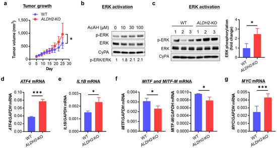 Effects of knocking out ALDH2 on A375 tumor growth, ERK activation, and mRNA expression of ATF4, IL1B, MITF, and MYC. (a) Tumor growth curves of A375 cells injected subcutaneously in 8 female nude mice (4 for WT and 4 for ALDH2-KO). (b) Western blot of p-ERK in A375 cells treated with 0–100 μM AcAH for 1 h. Band densities of phosphorylated ERK were quantified and adjusted by those of total ERK at the same dose of AcAH. (c) Western blot of ERK phosphorylation in three single clones of WT and ALDH2-KO A375 cells (left panel). Band densities of phosphorylated ERK were quantified and adjusted by those of total ERK (right panel). (d) qRT-PCR of ATF4 mRNA. (e) qRT-PCR of IL1B mRNA. (f) qRT-PCR of MITF and MITF-M mRNA. (g) qRT-PCR of MYC mRNA. The data are expressed as the mean ± SD (n = 8 (tumors, (a)) or 3 (c–g)). * p < 0.05 and *** p < 0.001.