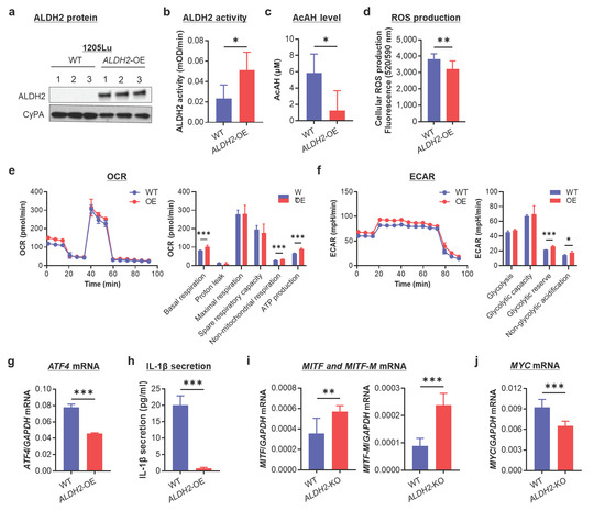 Effects of overexpressing ALDH2 on AcAH and ROS production, mitochondrial respiration, IL-1β secretion, and MITF/MYC expression in 1205Lu cells. (a) Confirmation of ALDH2 overexpression (OE) by Western blot. (b) Mitochondrial ALDH2 activity. (c) AcAH levels in culture medium. (d) Intracellular ROS levels were detected using a cellular ROS assay kit (Red). (e) Measurement of OCR. (f) Measurement of ECAR. (g) ATF4 mRNA. (h) IL-1β secretion by ELISA. (i) MITF and MITF-M mRNA. (j) MYC mRNA. The data are representative or expressed as the mean ± SD (n = 5 (b), 4 (c), 10 (d), 4–6 (e,f), 3 (g), 9 (h) or 6 (i,j). * p < 0.05, ** p < 0. 01, and *** p < 0.001.