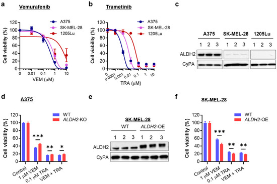 Relation of ALDH2 expression levels to sensitivity to BRAF and MEK inhibitors. (a) MTS proliferation assay of three BRAF-mutated melanoma cell lines treated with a single dose of vemurafenib (VEM) at the indicated doses for 72 h. (b) MTS proliferation assay of three melanoma cell lines treated with a single trametinib (TRA) dose at the indicated doses for 72 h. (c) Western blot analysis of ALDH2 levels in A375, SK-MEL-28, and 1205Lu cells (3 cell lysate samples each). (d) MTS proliferation assay of WT and ALDH2-KO A375 cells treated with one dose of 1 µM VEM and/or 0.1 µM TRA for 48 h. (e) ALDH2-OE in SK-MEL-28 cells was confirmed by Western blot. (f) MTS proliferation assay of WT and ALDH2-OE SK-MEL-28 cells treated with one dose of VEM and/or TRA for 48 h. The data are expressed as the mean ± SD (n = 3 (a,b) or 4 (d,f). * p < 0.05, ** p < 0.01, and *** p < 0.001.