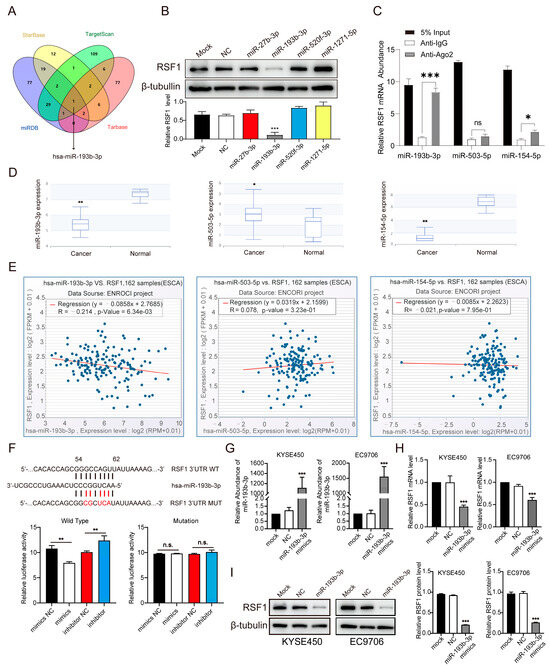 To identify potential miRNAs that regulate RSF1 in ESCC, we searched four miRNA prediction databases (Target Scan, Starbase, Tarbase, and miRDB) and identified miR-193b-3p, which was predicated by all four databases, as well as miR-27b-3p, miR-520f-3p, and miR-1271-5p, that were predicted from three databases (Figure 2A). To determine whether these miRNAs target RSF1, we transfected KYSE450 cells with miRNA mimics and examined the effect on RSF1 protein levels. Compared to untreated KYSE450 cells (Mock) and the negative control group (NC) transfected with scrambled miRNA sequences, only the miR-193b-3p mimic significantly reduced RSF1 protein levels, while the other miRNAs had minimal effects (Figure 2B). To determine whether miR-193b-3p directly binds to RSF1 mRNA, we performed a microRNA RNA immunoprecipitation (miRNA-RIP) assay. The Ago2-miRNA co-immunoprecipitation (co-IP) assay enriches miRNA-mRNA complexes bound to Argonaute2 (Ago2), the catalytic core of the RNA-induced silencing complex (RISC). This technique enables the identification of functional miRNAs that specifically bind their target mRNA sequences, as Ago2 selectively incorporates miRNAs exhibiting perfect or near-perfect complementarity to cognate targets. KYSE450 cells were transfected with miR-193b-3p mimics, miR-503-5p, or miR-154-5p mimics; the latter two miRNAs were previously reported to regulate RSF1 [,]. RSF1 mRNA enrichment in Ago2-containing granules was then examined. Compared to IgG controls, miR-193b-3p mimics significantly enriched RSF1 mRNA in Ago2 granules (8-fold enrichment, p < 0.001). In contrast, the miR-154-5p mimics resulted in only a modest increase (1-fold, p= 0.042), while miR-503-5p mimics showed no significant enrichment (p = 0.714). These results indicate that miR-193b-3p exhibits the strongest binding affinity to RSF1 mRNA in ESCC cells (Figure 2C). Further analysis of ESCC tissues revealed that miR-193b-3p and miR-154-5p expression levels were significantly downregulated compared to adjacent normal tissues, whereas miR-503-5p expression was markedly upregulated (Figure 2D). However, only miR-193b-3p and RSF1 levels demonstrated a significant inverse relationship in Correlation analyses in ESCC, whereas no significant correlation was observed between RSF1 and miR-503-5p or miR-154-5p (Figure 2E). To assess further the apparent predominance of miR-193b-3p in regulating RSF1 in esophageal cancer, we evaluated the expression levels and correlations of other RSF1-regulating miRNAs previously reported in other tumors. Our analyses revealed that miR-1224-5p [], miR-150-5p [], and miR-185-5p [] were significantly upregulated in esophageal cancer tissues, contrary to a suspected inhibitory role in regulating RSF1 expression. Indeed, none of these miRNAs showed a significant correlation with RSF1 expression (Supplementary Materials, Figure S2A–C). Although miR-129-5p [] was markedly downregulated in esophageal cancer, it exhibited a weak positive correlation with RSF1 (Supplementary Materials, Figure S2D). Based on these observations, we propose that miR-193b-3p directly and negatively regulates RSF1 levels in ESCC.
