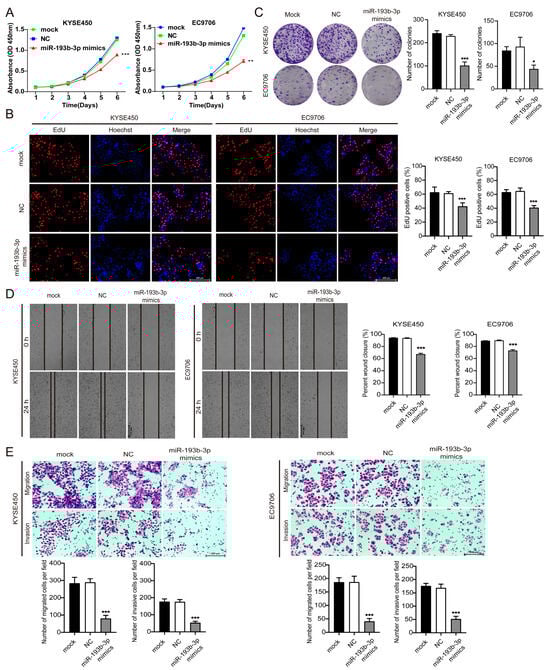 To investigate the role of miR-193b-3p in regulating ESCC cell growth and survival, we transfected miR-193b-3p mimics or negative controls into KYSE450 and EC9706 cells, cell lines with high endogenous RSF1. Transfection of miR-193b-3p mimics significantly reduced their proliferation rates compared to mock transfection and negative controls, as assessed by CCK-8 assays (Figure 4A). EdU incorporation assays confirmed a marked decrease in the fraction of cells in a proliferative state (Figure 4B). Moreover, the colony-forming ability of KYSE450 and EC9706 cells was significantly impaired (Figure 4C). These findings suggest that miR-193b-3p suppresses ESCC cell proliferation. Furthermore, wound-healing assays revealed that the migration of KYSE450 and EC9706 cells was significantly reduced after elevating miR-193b-3p with mimics compared to the mock or negative control (Figure 4D). Transwell assays demonstrated that both migration and invasion were also decreased, but not the mock or the negative control (Figure 4E). Flow cytometry analysis also showed that elevating miR-193b-3p increased cell apoptosis significantly (Supplementary Materials, Figure S3). Taken together, these results revealed that elevated levels of miR-193b-3p suppress ESCC cell proliferation, migration, and invasion while promoting apoptosis; thus, miR-193b-3p acts as a tumor suppressor in ESCC.