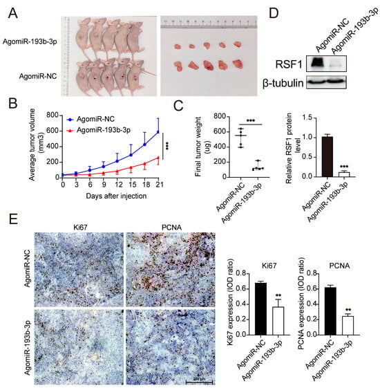 miR-193b-3p inhibits tumor growth and proliferation in vivo. (A) Representative images of xenograft tumors dissected from nude mice treated with AgomiR-193b-3p or AgomiR-NC. (B) Tumor growth curves of xenograft models demonstrate significantly reduced growth in AgomiR-193b-3p-treated group compared to AgomiR-NC controls (n = 5). *** p < 0.001. (C) Tumor weights from the xenograft formation assay indicate a significant reduction in tumor size in the AgomiR-193b-3p-treated group compared to AgomiR-NC controls. *** p < 0.001. (D) Immunoblot analysis of RSF1 protein levels in tumor tissues reveals a significant decrease in RSF1 expression in the AgomiR-193b-3p-treated group compared to controls (n = 5). (E) Immunohistochemical (IHC) staining of Ki-67 (left panel) and PCNA (right panel) in xenograft tumors reveals a marked reduction in cells positive for the proliferation marker expression in the AgomiR-193b-3p-treated group compared to AgomiR-NC controls. The IOD ratio is shown at right. Scale bar are indicated. n = 5 for each group. ** p < 0.01.