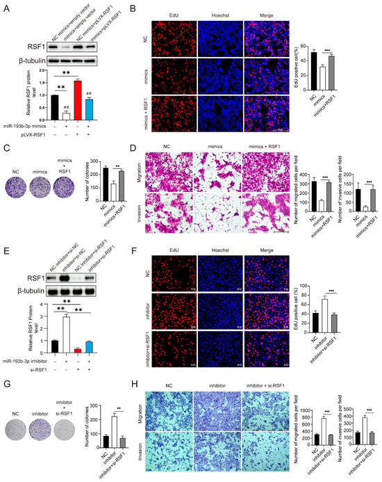 miR-193b-3p regulates ESCC progression through RSF1. (A) Immunoblot analyses showing the levels of RSF1 in KYSE450 transfected with miR-193b-3p mimics or an NC control along with RSF1 expression plasmid or an empty vector as indicated below. Representative images are shown at top and quantifications are shown at bottom. ** p < 0.01, ## p < 0.01. (B) EdU assays demonstrating that exogenous RSF1 expression reversed the inhibitory effect of miR-193b-3p mimics. Representative images are shown at left and quantifications are shown at right. *** p < 0.001. (C) Colony formation assays showing that exogenous RSF1 expression restored colony-forming ability in KYSE450 cells transfected with miR-193b-3p mimics. Representative images are shown at left and quantifications are shown at right. ** p < 0.01. (D) Transwell assays indicate that exogenous RSF1 expression rescued the reduced migration and invasion of KYSE450 caused by transfected miR-193b-3p mimics. Representative images are shown at left and quantifications are shown at right. *** p < 0.001. (E) Immunoblot analyses of RSF1 levels in KYSE450 cells transfected by miR-193b-3p inhibitor or an NC control along with si-RSF1 as indicated below. Representative images are shown at the top and quantifications are shown at the bottom. ** p < 0.01. (F) EdU assay demonstrating that RSF1 silence reversed the elevated cell growth in miR-193b-3p inhibitor transfected cells reversed effects. Representative images are shown at left and quantifications are shown at right. *** p < 0.001. (G) Colony formation assays showing that silencing RSF1 in miR-193b-3p inhibitor transfected cells reversed the increased colony-forming ability. Representative images are shown at left and quantifications are shown at right. ** p < 0.01. (H) Transwell assays indicating that silencing RSF1 in miR-193b-3p inhibitor transfected cells reversed the increased migration and invasion. Representative images are shown at left and quantifications are shown at right. Scale bar = 200 μM. *** p < 0.001.