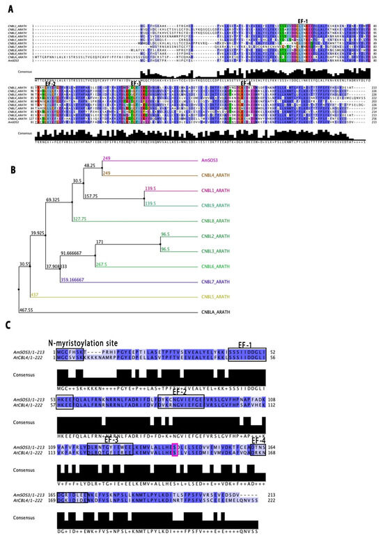 Sequence and phylogenetic analysis of AmSOS3. (A) Protein sequence alignment of AmSOS3 against all known Calcineurin B-like (CBL) proteins (CBL1–CBL10) from Arabidopsis thaliana. (B) Phylogenetic tree constructed using the average distance method and the BLOSUM62 (Jalview). (C) Sequence alignment of AmSOS3 and AtSOS3(CBL4), indicating the N-myristoylation domain, the four EF hands, and Ser 140 for dimerization in the pink box.