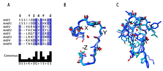 EF-hand domains. (A) Sequence alignment of the EF-hand motifs from AmSOS3 and AtSOS3, highlighting the conserved calcium-binding residues. (B) Superimposed backbone structures of all four EF-hand motifs of AmSOS3, showing the loop arrangement essential for calcium coordination. (C) Atom-level representation of the EF-hand motifs, emphasizing the spatial conservation of key residues and the X, Y, Z/−X, −Y, −Z coordinates, which define structural positioning and functional interactions.