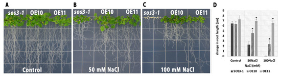 To determine whether AmSOS3 can functionally complement the sos3-1 mutant phenotype, sos3-1 mutant Arabidopsis thaliana plants were transformed with the pRI 201-AN:35S::AmSOS3 construct, in which AmSOS3 is under the control of the 35S promoter. The growth of two independent transgenic lines (OE10 and OE11) and non-transformed mutant plants was evaluated under salt stress conditions on ½ MS medium supplemented with either 50 mM or 100 mM NaCl. Under normal conditions, both transgenic and mutant plants exhibited comparable growth (Figure 4A). However, in the presence of 50 mM NaCl, transgenic lines consistently displayed improved growth, while sos3-1 mutants exhibited severe growth retardation (Figure 4B). At 100 mM NaCl, the sos3-1 mutants failed to survive, whereas all transgenic plants continued to grow (Figure 4C and Figure S2). The root growth of transgenic plants was greater than that of the sos3-1 mutants in both conditions (Figure 4D). These results provide compelling evidence that AmSOS3 is a functional ortholog of AtSOS3, fully capable of restoring salt tolerance in the sos3-1 mutant background, thereby highlighting its critical role in the SOS signaling pathway.
