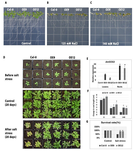 To evaluate whether the heterologous expression of AmSOS3 confers salt tolerance, wild-type (WT) Arabidopsis thaliana plants were transformed with the pRI 201-AN:35S::AmSOS3 plasmid. The expression of AmSOS3, under the constitutively active 35S promoter, was confirmed in both roots and leaves of two independent transgenic lines (OE9, OE12) using quantitative PCR. No expression was detected in WT plants (Figure 5E). Although AmSOS3 was expressed under the constitutive CaMV 35S promoter, AmSOS3’s expression was notably higher in roots than in leaves in both lines. Similar patterns of root-preferential expression under the 35S promoter have been documented, as previous studies showed that its activity varies across tissues and developmental stages, with consistently higher expression levels in roots [37,38]. These results confirmed the successful integration of AmSOS3 in the transformed plants. Importantly, no developmental defects were observed in the transgenic plants. To assess the effect of AmSOS3 overexpression on salt tolerance, WT, and transgenic lines were subjected to salinity stress by growing them on ½ MS agar plates supplemented with 125 mM or 140 mM NaCl. There were no significant differences in the root length between the transgenic lines and WT plants under non-stress conditions (Figure 5A). In stressed conditions, transgenic lines consistently exhibited better growth and survival than WT plants under both salt concentrations (Figure 5B,C and Figure S4). To further assess the impact of AmSOS3 overexpression on salt tolerance, transgenic and WT plants were grown in pots and subjected to salinity stress through irrigation with 150 mM NaCl solution. Under control conditions, both transgenic and WT plants exhibited comparable growth (Figure 5D). Upon exposure to salt stress, while WT plants exhibited chlorosis, reduced biomass, and lower survival rates, the transgenic lines maintained better growth and displayed fewer stress symptoms (Figure 5D). Transgenic plants demonstrated improved overall performance under salt stress, with significantly higher survival rates compared to WT (Figure 5G). These results indicate that overexpression of AmSOS3 enhanced salt stress tolerance in Arabidopsis, supporting its functional role in stress adaptation.
