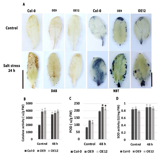 Evaluation of ROS and antioxidant enzyme activity. (A) Histochemical staining for superoxide (NBT staining) and hydrogen peroxide (DAB staining) accumulation in WT and AmSOS3 transgenic lines under control and salt stress conditions. Bars = 1 cm. (B) Quantitative antioxidant enzyme activities of catalase (CAT), (C) peroxidase (POD), and (D) superoxide dismutase (SOD) in WT and transgenic lines exposed to salt stress (n = 3). SD was shown as an error bar. An asterisk indicates statistical significance.