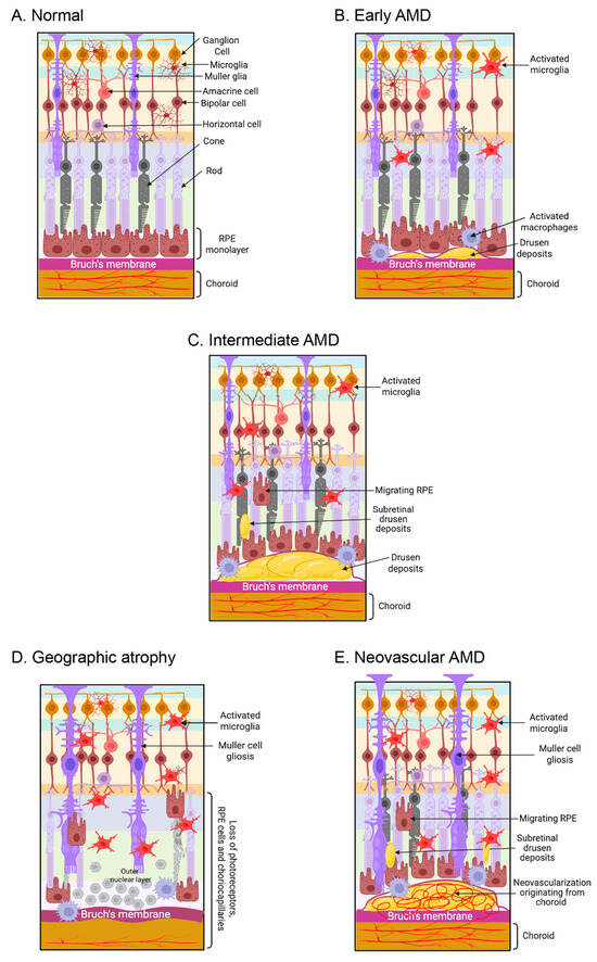 AMD affects retinal photoreceptors, retinal pigment epithelium (RPE), Bruch’s membrane, and choroid choriocapillaris. (A) The schematic diagram illustrates a normal retina-RPE-Bruch’s membrane-choroid complex. (B) The early phases of AMD are marked by the accumulation of drusen (extracellular debris), activated microglia, and macrophages. (C) In the intermediate phase of AMD, accumulation of drusen and subretinal drusen deposits were observed in the retina, along with pathological alterations in the RPE and the migration of RPE cells into the retina. (D) Loss of the photoreceptors, RPE, and choriocapillaris are observed in dry AMD. (E) In wet AMD, macular neovascularization invades the outer retina, subretinal space, or subretinal pigment epithelium space. The figure is created with www.biorender.com (accessed on 15 March 2025).