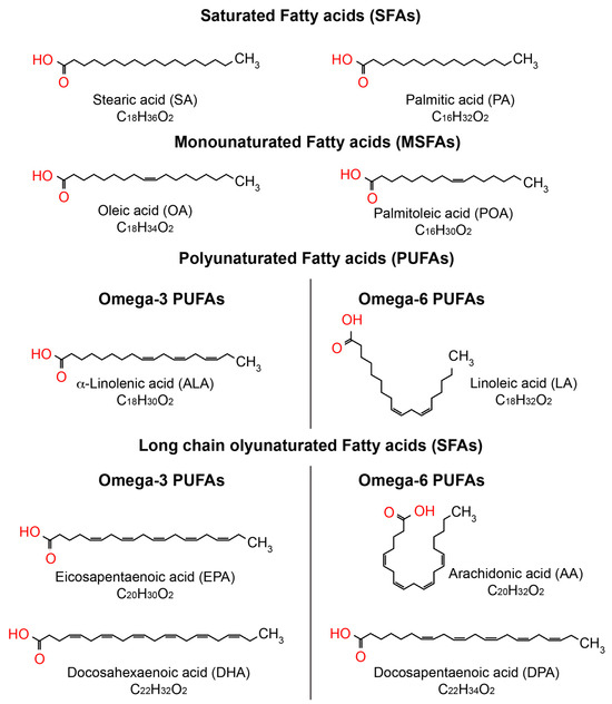 Fatty acids are vital for the human body, as they perform various functions such as energy supply, cell membrane formation, and the improvement of cardiovascular health [27,28]. Fatty acids are categorized based on their chain length and the existence of double bonds. Fatty acids consist of a hydrocarbon chain of varying length, terminating in a carboxyl group. SFAs lack double bonds, MUFAs have only one double bond, while PUFAs possess two or more than two double bonds, as illustrated in Figure 2. The position of the first double bond relative to the terminal methyl group classifies polyunsaturated fatty acids (PUFAs) into omega-3 (double bond on the third carbon) and omega-6 (double bond on the sixth carbon) [27,28]. Omega-9 fatty acids are MUFAs characterized by the presence of the first double bond on the ninth carbon atom [27,28].