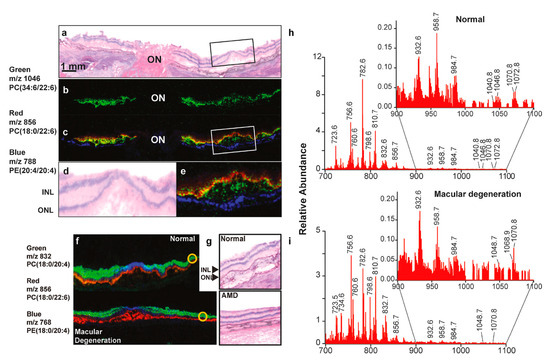 MALDI imaging reveals the distribution of PUFAs within the retinal photoreceptor layer. (a) Hematoxylin and eosin staining of the optic nerve (ON) and the fovea of a normal retina. (b) MALDI imaging identifies the very long-chain PUFA (m/z 1046, green). (c) The composite picture of VLC-PUFA (green) and photoreceptors (red). The colocalization (yellow) of VLC-PUFAs and photoreceptors is seen. The RPE layer is in blue color. (d,e) Depicts the enlarged boxed regions of (a) and (c), respectively. INL and ONL denote the inner nuclear layer and outer nuclear layer, respectively. (f) MALDI pictures of a normal retina and an AMD retina. The photoreceptor layer is represented in red; the inner retina is shown in green, and the central macular region is depicted in blue. (g) The H&E sections show the regions of interest (yellow circles), illustrating the intensity of phospholipids in both normal and AMD retinas. (h,i) Spectra with mass numbers ranging from 700 to 1100 m/z were acquired from outlying locations, which are indicated by the yellow-circled areas in (f). The regions from 900 to 1100 m/z have been expanded as an insert to illustrate variations among the VLC-PUFAs, which are observed between 1000 m/z and 1100 m/z. Reproduced with permission from Gordon et al., Exp Eye Res. 235, 109639 (2023) [103]. Copyright © 2023, Elsevier.