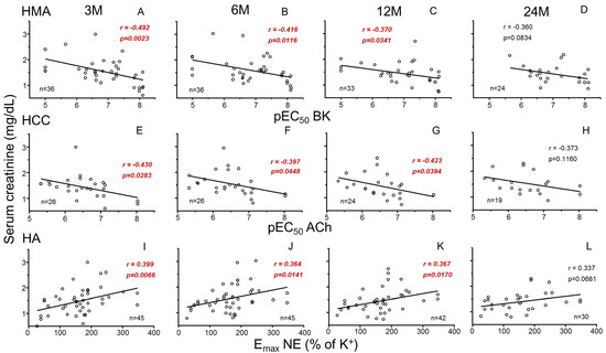 Correlations between parameters of systemic vascular function of donors and evolution of recipients’ serum creatinine. Graphs show correlations of endothelial vasodilation (X-axis) in human mesenteric arteries (HMAs) determined as −log molar of concentration required to obtain 50% relaxation (pEC50) for bradykinin (BK) (A–D), endothelial relaxation in human corpus cavernosum (HCC) determined as pEC50 for acetylcholine (ACh) (E–H), and adrenergic contraction in human aorta (HA) determined as the maximum response (Emax) to norepinephrine (NE) expressed as the percentage of K+-induced contraction (I–L) from kidney donors with serum creatinine concentrations (Y-axis, mg/dL) in respective kidney recipients at 3 (3 M), 6 (6 M), 12 (12 M) and 24 months (24 M) after transplantation. Correlation coefficients and p-values are indicated for each correlation. Significant associations are highlighted by p-values in red. n indicates the number of determinations.