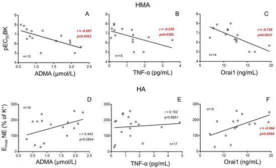 When plasma sample was available, its concentrations of the inflammatory cytokine, TNF-α, the endogenous NO-synthase inhibitor, ADMA, and the calcium channel, Orai1, were determined. In donors, endothelial vasodilation of HMAs significantly and negatively correlated to plasma concentrations of ADMA, TNF-α and Orai1 (Figure 4A–C) while contractile responses in HA only significantly and positively correlated with Orai1 in plasma (Figure 4D–F).