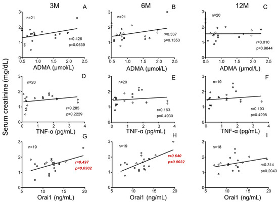 Donors’ plasmatic concentrations of Orai1 but not those of ADMA or TNF-α are positively associated with serum creatinine concentrations in kidney recipients. Influence of donors’ plasma concentrations of asymmetric dimethyl arginine (ADMA) (A–C), tumor necrosis factor-α (TNF-α) (D–F) and Orai1 (G–I) on serum creatinine concentrations in kidney recipients at specific evolution times (3 (3 M), 6 (6 M) and 12 months (12 M) after transplantation). Correlation coefficients and p-values are indicated for each correlation. Significant associations are highlighted by p-values in red. n indicates the number of determinations.