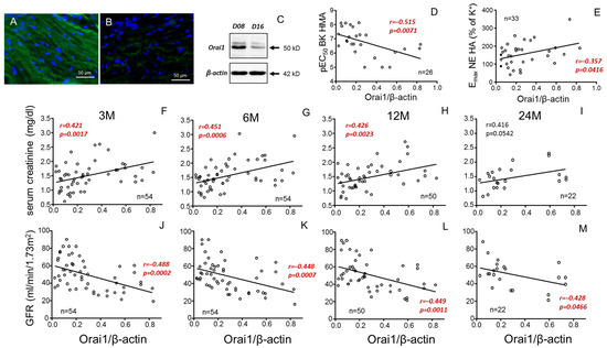 Negative correlation of donor aortic Orai1 expression with vasodilation of mesenteric arteries and recipient renal function. Panels (A,B) show immunofluorescence detection of Orai1 in smooth muscle of aortic tissues from two different donors displaying high ((A), D08) and low ((B), D16) immunostaining which is confirmed by immunoblot (C). Panels (D,E) show correlations of aortic expression of Orai1 expressed as Orai1/β-actin immunoblot band intensities ratio with endothelial vasodilation expressed as pEC50 for bradykinin (BK) in mesenteric arteries (HMAs) (D) and aortic vasoconstriction expressed as Emax for norepinephrine (NE) (E) from the same donors. Other panels show correlations of aortic expression of Orai1 in donors with serum creatinine concentrations (F–I) and glomerular filtration rate (GFR) (J–M) in respective kidney receptors at specific evolution times (3 (3 M), 6 (6 M), 12 (12 M) and 24 months (24 M) after transplantation). Correlation coefficients and p-values are indicated for each correlation. Significant associations are highlighted by p-values in red. n indicates the number of determinations. Complete annotated images of immunoblots for Orai1 and β-actin are provided in Supplementary Figure S4.