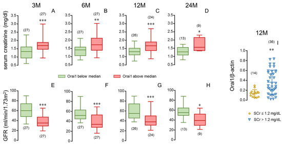Stratification of aortic expression of Orai1 in donors and stratification of serum creatinine in kidney recipients confirm the determinant role of donor vascular Orai1 expression in recipient renal function. Serum creatinine concentrations (SCr, (A–D)) and glomerular filtration rates (GFR) (E–H) of kidney recipients at specific evolution times (3 (3 M), 6 (6 M), 12 (12 M) and 24 months (24 M) after transplantation) corresponding to donors displaying high (above median) or low (below median) aortic expression of Orai1 determined as Orai1/β-actin immunoblot band intensities ratio. Data are summarized in box-and-whiskers plots with complete range. Panel (I) shows aortic expression of Orai1 in donors corresponding to kidney recipients displaying SCr concentrations equal or below 1.2 mg/dL (≤1.2) and those displaying higher creatinine levels (>1.2) at 12 months after transplantation. Data are expressed as individual values and mean ± S.D. number of subjects is in parentheses. * p < 0.05, ** p < 0.01, *** p < 0.001 by Mann–Whitney U-test.