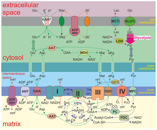 The model also describes glycolysis, the Krebs cycle, oxidative phosphorylation, ATP consumption, and the transport of some metabolites through the cellular and inner mitochondrial membranes in the normal ATP-producing state and during the MPT. Accounting for neurotransmitter glutamate transport and metabolism details, including the malate–aspartate shuttle, allows this model to analyze neuronal cell specificity. Figure 1 shows the scheme of the model.