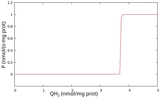The efflux of mitochondrial metabolites due to the MPT is proportional to the permeability coefficient (P) and the concentration of respective metabolites, in accordance with the Goldman–Hodgkin–Katz flux equation [15,16]. According to Figure 2, P is practically zero at low QH2 concentrations and reaches its maximum value when QH2 surpasses a threshold of the RC transition from an ATP- to an ROS-producing state, when the ROS burst induces the MPT.