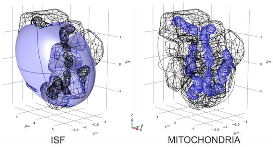 Three-dimensional digital phantom of an isolated area of the brain parenchyma. It contains two dendrites, including eight mitochondria (right panel, blue), three astrocytes, five synaptic contacts, and a part of interstitial fluid (ISF) [22], which is mimicked by an ellipsoid interacting with other domains (left panel, blue). For a thorough explanation, see Text S2.
